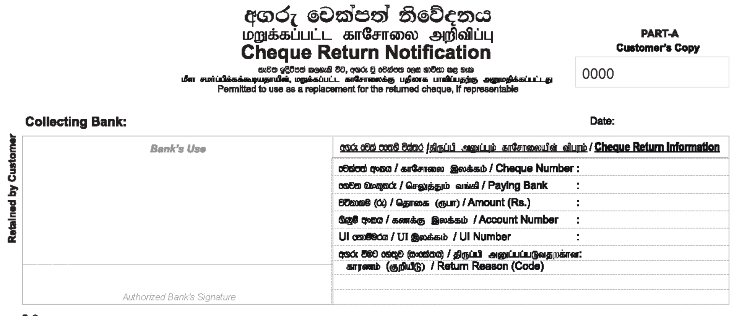 பகுதி அ என்பது வாடிக்கையாளரின் நகல் மற்றும் வாடிக்கையாளரால் தக்கவைக்கப்பட வேண்டும். காசோலை எண்> பணம் செலுத்தும் வங்கி> தொகை> கணக்கு எண் UI எண் மற்றும் திரும்புவதற்கான காரணக் குறியீடு ஆகியவற்றின் தகவல்கள் இதில் உள்ளன.